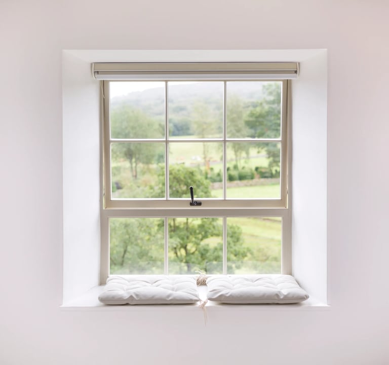 We will blend the exposures from three to five photos of the same frame at different brightness levels, so that the view outside the window is clear, rather than appearing as a mere "white blob" of light.